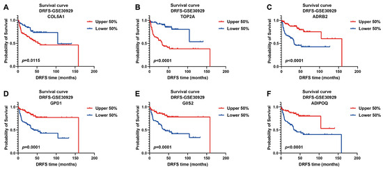 The prognostic values of these signature genes were estimated by plotting Kaplan–Meier survival curves using DRFS data from GSE30929. As illustrated, patients with high expression of risk genes were significantly associated with worse DRFS (COL5A1, p = 0.0115; TOP2A, p < 0.0001, Figure 5A,B), indicating that they act as prognostic risk factors implicated in LPS progression. On the contrary, high expression of protective genes predicted better DRFS of patients (ADRB2, p < 0.0001; GPD1, p = 0.0001; G0S2, p = 0.0001; ADIPOQ, p < 0.0001, Figure 5C–F), implying their protective benefit to LPS prognosis.