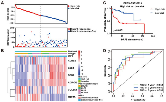 Prognostic value estimation of the six-gene signature for LPS. (A) Scatter diagrams visualize risk scores (upper) and DRFS (lower) of patients in the GSE30929 dataset. (B) A heat map of gene expression illustrates risk level, histological subtype LPS and DRFS status of patients ranked by risk score from the highest to the lowest. (C) Kaplan–Meier survival analysis of patients divided into high- and low-risk groups by the median of risk score. (D) ROC curves of 1-, 3- and 5-year DRFS with AUC values for predicting the efficacy of this risk model.