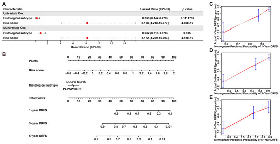Nomogram predicting 1-, 3- and 5-year DRFS for LPS patients based on histological subtype and risk score. (A) Cox regression analysis of histological subtype and risk score in LPS. (B) A nomogram of 1-, 3- and 5-year estimates of the probabilities of DRFS of LPS patients. (C–E) Calibration curves of 1-, 3- and 5-year DRFS predictions.