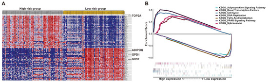 Gene set enrichment analysis (GSEA) of LPS patients stratified by risk score. (A) GSEA heat map illustrated by risk level. (B) Enrichment score for each pathway and corresponding gene hits.