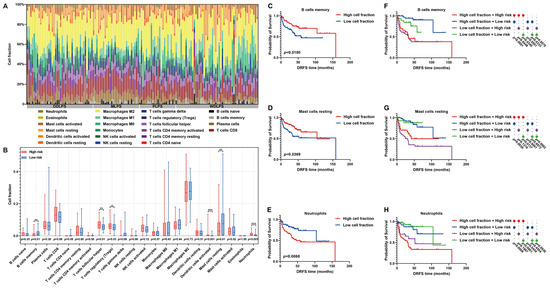 Immune infiltration analysis of LPS TME between high- and low-risk patients. (A) A histogram of immunoprofile visualizes different immune cell proportions of each patient in the GSE30929 dataset. (B) A box map shows cell proportion differences between high- and low-risk patients. (C–E) Kaplan–Meier survival curves illuminate the prognostic value of cell proportion of memory B cells, resting mast cells and neutrophils in LPS microenvironment. (F–H) Comprehensive Kaplan–Meier survival curves with immune cell abundance and risk score reveal the prognostic features of LPS patients. * p < 0.05, ** p < 0.01, *** p < 0.001.