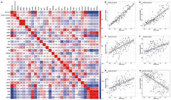 Pearson’s correlation analysis between risk score and drug targets for LPS. (A) A correlation heat map of risk score, distant recurrence, expression of target genes and six signature genes. (B–G) Scatter plots illuminate the correlation between risk score and drug target gene expression. * TOP2A is both a drug target and one of the six signature genes.