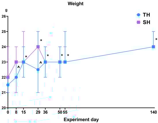 Body weight dynamics in TH and SH mice during the experiment. *—statistically significant differences relative to the beginning of the experiment; ^—statistically significant differences between TH and SH.