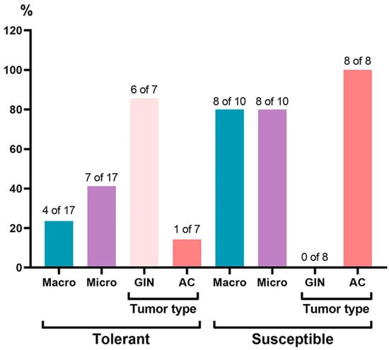 Frequency of tumor development in the distal colon of mice that were tolerant and susceptible to hypoxia on the 141st day of the experiment. GIN—glandular intraepithelial neoplasia, AC—adenocarcinoma.