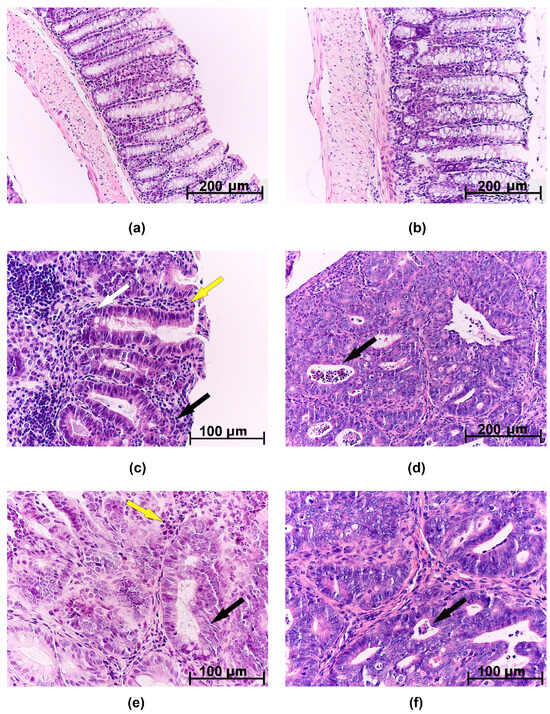 Morphological study of the distal colon in mice from experimental groups that were tolerant and susceptible to hypoxia. Control: (a) tolerant to hypoxia; (b) susceptible to hypoxia; GIN: (c) tolerant to hypoxia; adenocarcinoma: (e) tolerant to hypoxia; (d,f) susceptible to hypoxia. Hematoxylin and eosin staining. (a,b) The epithelium is preserved, crypts are high and narrow, many goblet cells, and narrow submucosa; (c) the yellow arrow indicates the inflammatory infiltrate, the white arrow indicates a decrease in the number of goblet cells, and the black arrow indicates disruption of crypt architectonics; (d,f) the black arrow indicates crypt abscesses; (e) the yellow arrow indicates atypical cells and the black arrow indicates disruption of the crypt architectonics.
