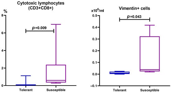 Relative number of cytotoxic T-lymphocytes and absolute number of vimentin-positive cells in tumors localized in the distal colon of mice that were tolerant and susceptible to hypoxia in CAC. Me (25–75%). p—statistical significance of differences, Mann–Whitney test.