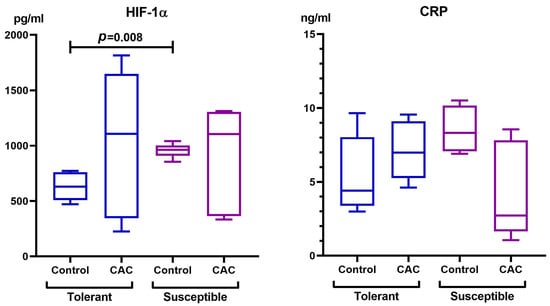 Serum HIF-1α and CRP levels in mice that were tolerant and susceptible to hypoxia in CAC. Me (25–75%). p—statistical significance of differences, Mann–Whitney test.