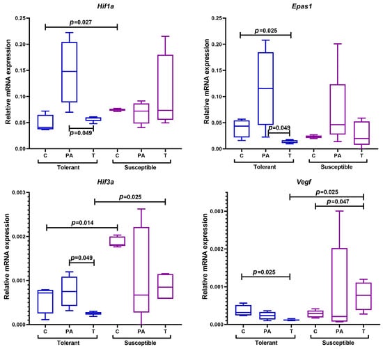 Expression levels of Hif1a, Epas1, Hif3a, and Vegf mRNA in the distal colon of mice that were tolerant and susceptible to hypoxia. Me (25–75%). p—statistical significance of differences, Mann–Whitney, Kruskal–Wallis, and Dunn tests. C—normal colon tissue of mice in the control groups, PA—peritumoral area tissue of mice in the experimental groups, T—tumor tissue of mice in the experimental groups.