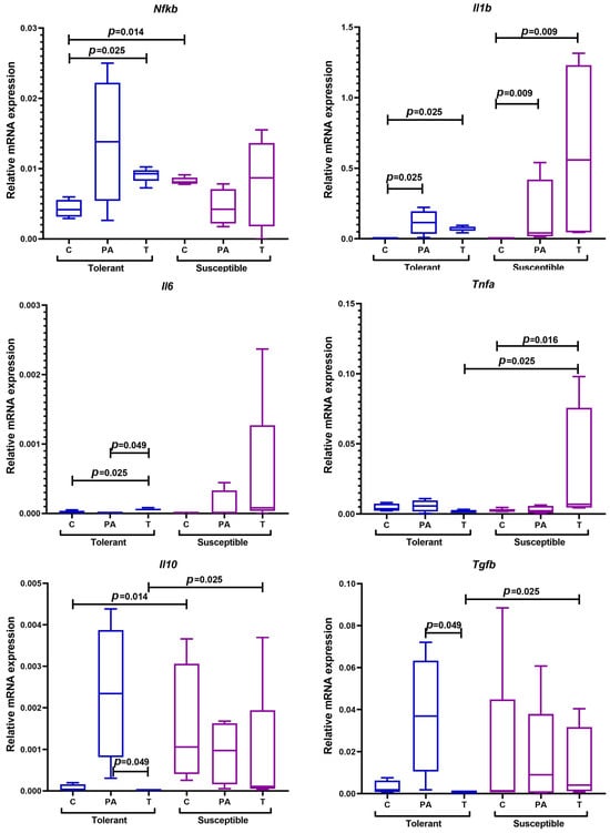 Expression levels of Nfkb, Il1b, Il6, Tnfa, Il10, and Tgfb mRNA in the distal colon of mice that were tolerant and susceptible to hypoxia. Me (25–75%). p—statistical significance of differences, Mann–Whitney, Kruskal–Wallis, and Dunn tests. C—normal colon tissue of mice in the control groups, PA—peritumoral area tissue of mice in the experimental groups, T—tumor tissue of mice in the experimental groups.