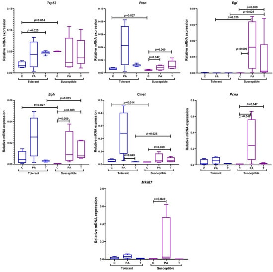Expression levels of Trp53, Pten, Egf, Egfr, Cmet, Pcna, and Mki67 mRNA in the distal colon of mice that were tolerant and susceptible to hypoxia. Me (25–75%). p—statistical significance of differences, Mann–Whitney, Kruskal–Wallis, and Dunn tests. C—normal colon tissue of mice in the control groups, PA—peritumoral area tissue of mice in the experimental groups, T—tumor tissue of mice in the experimental groups.