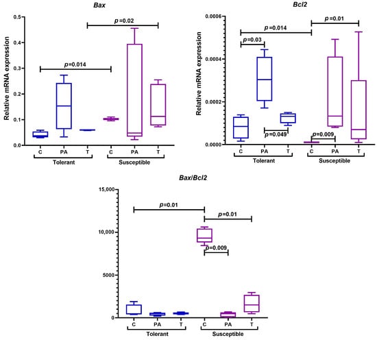 Expression levels of Bax, Bcl2 mRNA, and the Bax/Bcl2 ratio in the distal colon of mice that were tolerant and susceptible to hypoxia. Me (25–75%). p—statistical significance of differences, Mann–Whitney, Kruskal–Wallis, and Dunn tests. C—normal colon tissue of mice in the control groups, PA—peritumoral area tissue of mice in the experimental groups, T—tumor tissue of mice in the experimental groups.