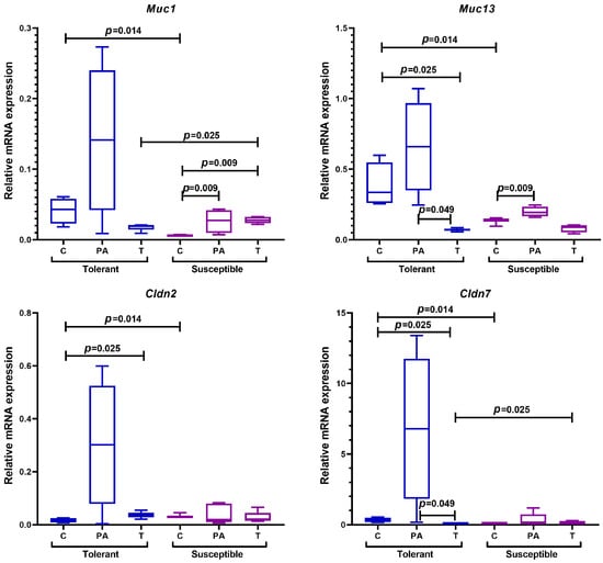 In the control groups of animals, higher Cldn2 expression was detected in the SH animals, while for the TH animals, higher Muc1, Muc13, and Cldn7 expression was demonstrated (Figure 10).