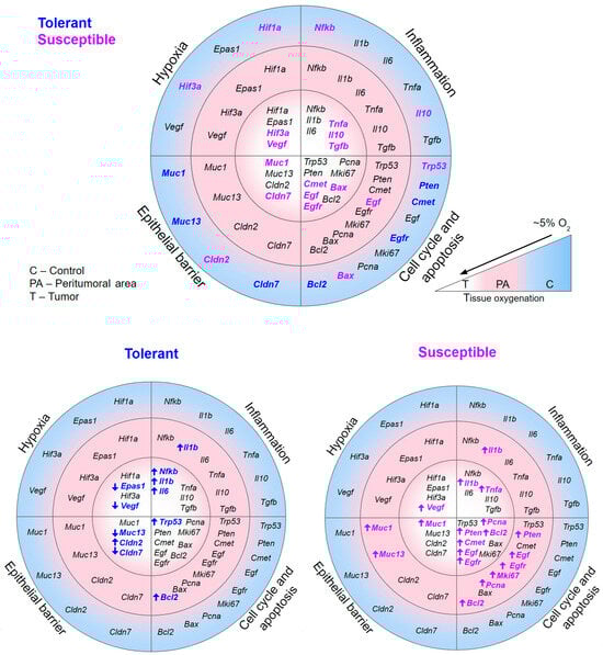 Changes in the expression of mRNA Hif1a, Epas1, Hif3a, Vegf, Nfkb, Il1b, Il6, Tnfa, Il10, Tgfb, Trp53, Pten, Cmet, Egf, Egfr, Pcna, Mki67, Bax, Bcl2, Muc1, Muc13, Cldn2, and Cldn7 in tumors and the peritumoral area of mice that were tolerant and susceptible to hypoxia. Oxygen levels in colon tissue [,] are taken as normal tissue oxygen saturation. Bold blue indicates an increase in mRNA expression in the tolerant to hypoxia animals of the experimental group; bold purple indicates an increase in mRNA expression in the susceptible to hypoxia animals of the experimental group.