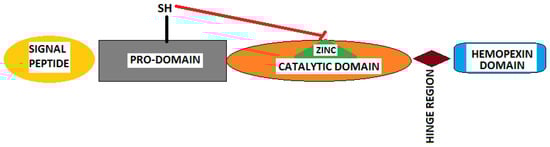 A schematic of the domains that can be found in all the MMPs in their pro-enzymatic state: a pro-domain that inhibits the zinc from the catalytic domain and that must be removed for enzymatic activation, a signal peptide (for secretion of MMPs; not present in membrane-type MMPs), a small hinge region, and the hemopexin domain that is responsible for substrate recognition and linkage.