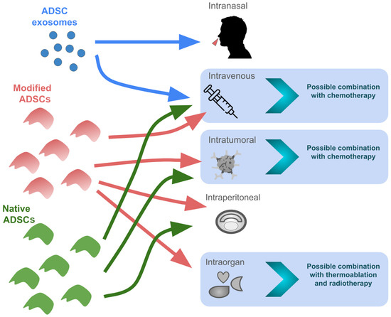 Potential ways of administrating native and modified ADSCs and ADSC exosomes independently or in combination therapies. The intranasal administration of ADSC-derived exosomes has been proven to be effective in the treatment of ischemic nerve damage in mice [125], but their effectiveness in the treatment of cancer has not yet been confirmed.