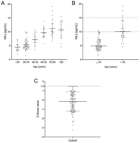 Figure 2. Levels of neurofilaments by age group (A), divided into individuals younger and older than 45 years, with their normal values as the 90th percentile (B) and Z-score (C) for the entire cohort.