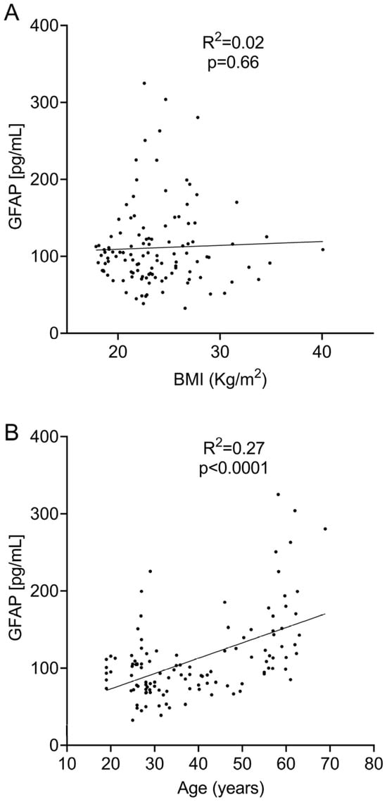Figure 3. Linear regression analysis between sGFAP levels and BMI (A) and age (B).