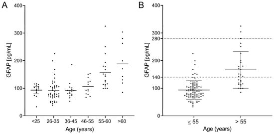 Figure 4. sGFAP levels according to age groups: (A) divided into individuals younger and older than 55 years with their normal values as the 90th percentile; (B) for the entire cohort.
