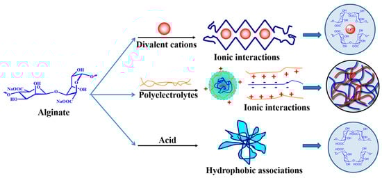 If the alginate solution’s pH is quickly lowered by adding acid directly, an alginic acid hydrogel based on hydrophobic associations will be produced [51]. When the pH of the water solubility of alginate is adjusted below the pKa value of the monomer, a sol-gel transformation will occur, and the formation of this hydrogel depends on intermolecular hydrophobic associations and hydrogen bonding [52]. It has been reported that acid crosslinked hydrogels are currently prepared by adding lactones (e.g., D-(+)-gluconate δ-lactones) to an alginate solution for slow proton release or by the proton replacement of calcium alginate hydrogels into alginate acid hydrogels [52,53].