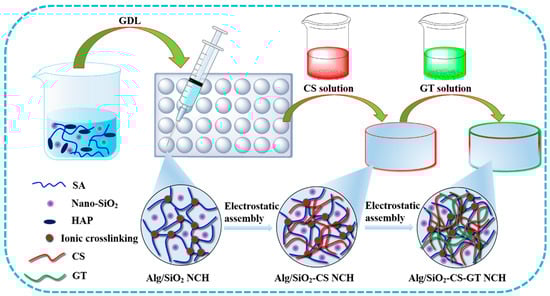 Diagram illustrating the process of creating Alg/SiO2-CHI-GA NCH using electrostatic adsorption and endogenous crosslinking [75].