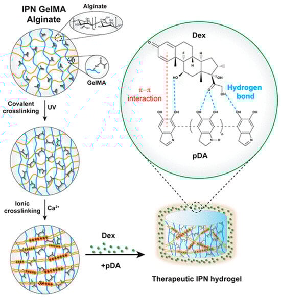 Recently, alginate and natural polymers as well as their derivatives (polysaccharides and proteins) or synthetic polymers have been blended to create IPN composite hydrogels, which address the shortcomings of pure alginate hydrogels that have low biological activity and poor mechanical properties. For example, Hu et al. [78] demonstrated the use of a coaxial microfluidic chip to create stretchable helical hydrogel microsprings using an interpenetrating network (IPN) hydrogel made of alginate and GelMA materials. Helical structures are known for their superior elasticity. Furthermore, the hydrogel microsprings offered an appropriate mechanical microenvironment for improving cell infiltration and supporting in situ muscle tissue regeneration in rat models when they were sized appropriately and used as injectable micro-scaffolds. Bai et al. [79] prepared poly(N,N-dimethylacrylamide) (PDMAA)/alginate (SA) IPN composite hydrogels and PDMAA/chitosan (CS) semi-IPN composite hydrogels using alginate, N, N-dimethylacrylamide (DMAA), and chitosan as the raw materials. The mechanical strength and fatigue resistance of the two types of composite hydrogels were analyzed and studied, and it was discovered that their mechanical strength could be greatly increased by adding natural polymers, while PDMAA/SA IPN composite hydrogels showed higher mechanical strength but poor stability, and PDMAA/CS semi-IPN composite hydrogels showed excellent fatigue stability. However, their mechanical strength was relatively low, indicating that IPNs had a high crosslinking density conducive to toughening, while semi-IPNs were conducive to energy dissipation. Pacelli et al. [80] obtained IPN composite hydrogels of methylacrylylated gelatin (GelMA) and alginate based on the photochemical crosslinking of GelMA and ion crosslinking of alginate, and then modified the IPN composite hydrogels with polydopamine (pDA). A pDA adhesive layer is formed on their surface to adsorb the bone-inducing drug dexamethasone (Dex), as shown in Figure 4. In the first week of the experiment, the results demonstrated that Dex was effectively adsorbed and retained on the surface of the composite hydrogels by pDA, causing adipose-derived stem cells to undergo delayed osteogenic differentiation. To increase the composite hydrogels’ suitability for bone tissue regeneration, the dose relationship between Dex and pDA should be further optimized to realize the regulation of the adsorption retention time of Dex on the composite hydrogels by pDA, thus achieving the purpose of regulating the osteogenic differentiation of stem cells.