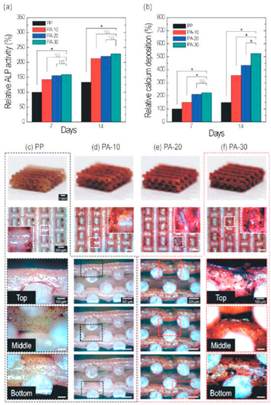 On composite scaffolds with different alginate weight fractions from 7 to 14 days, (a) relative alkaline phosphatase (ALP) activities and (b) relative calcium deposition levels were measured. (c–f) Three-dimensional form and cross-sectional optical pictures of the scaffolds’ ARS staining following a 14-day culture period. A significant difference is indicated by * p < 0.05, while non-significance is indicated by NS [115].