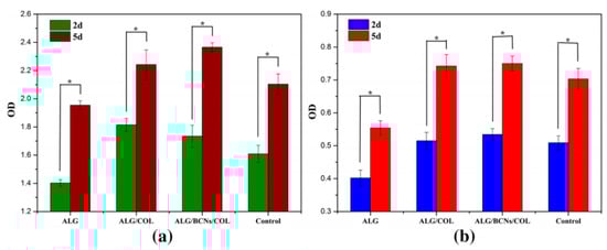 It is report that alginate and some bioactive proteins or polypeptides (RGDs) can be compounded by physical or chemical modifications to provide the alginate hydrogel scaffold with cell-specific recognition sites, so that osteoblasts can adhere, proliferate, and differentiate on its surface, thus making it a hopeful candidate for BTE applications. Yan et al. [113] combined alginate with collagen (COL) and bacterial cellulose (BCN) to fabricate homogeneous ALG/BCNs/COL composite hydrogel scaffolds through ion crosslinking under the condition of CaCO3-GDL. The results showed that the adhesion of MC3T3-E1 cells and h-AMS cells was poor on pure alginate hydrogel scaffolds, but good on alginate composite hydrogel scaffolds mixed with collagen, indicating that the ALG/BCNs/COL composite hydrogel scaffolds’ biological activity was noticeably higher than that of the hydrogel material made entirely of alginate. In vitro cell culture experiments on ALG/COL and ALG/BCNs/COL composite hydrogels demonstrated good cell growth and proliferation for both MC3T3-E1 and h-AMS cells, indicating that ALG/BCNs/COL composite hydrogels had good biocompatibility, as shown in Figure 6. In addition, using measurements of the composite hydrogels’ mechanical characteristics, porosity, and swelling rate proved that the composite scaffolds have an appropriate swelling property, high porosity, good compressive strength, and excellent biocompatibility, making them ideal scaffold materials with potential application value. Yao et al. [119] chemically modified alginate with an RGD peptide and successfully prepared a microporous alginate composite hydrogel (RGD/MA). In an in vitro cell culture experiment, ATDC5 cells were inoculated on a microporous RGD/MA scaffold and control group of an MA scaffold, and a CCK-8 kit was used to measure the ATDC5 cells’ ability to proliferate on MA and RGD/MA scaffolds. It was found that the cells in both groups showed good proliferation trends during cell culture. However, compared with the control group of the MA scaffold, the RGD/MA scaffold could promote cell proliferation, indicating that alginate can improve the biological activity of alginate hydrogels after the chemical modification of RGD. Then, a series of experiments including RT-PCR, hematoxylin eosin (H&E) and Toluidine blue O staining cells proved that the RGD/MA composite scaffold could improve the expression of cartilage genes, indicating that the biocompatibility of alginate composite hydrogel scaffolds was improved by RGD modification.