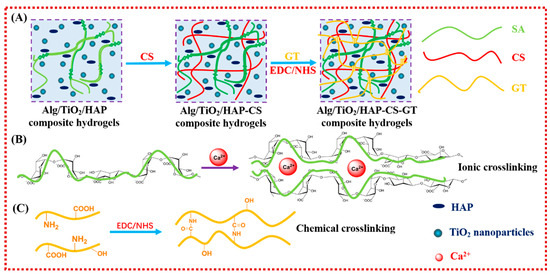 (A–C) Diagram showing the sequential electrostatic assembly of CS and GT after the endogenous ionic crosslinking of alginate to create Alg/TiO2/HAP-CS-GT composite hydrogels [130].