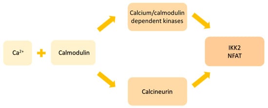 Calcium plays a role in inflammatory processes as a secondary messenger. Its abnormal deposition in the extracellular matrix, occurring during dystrophic or repair processes, is the basis for ectopic calcifications in bone and extraskeletal spaces. Ankylosing spondylitis is a rheumatic disease characterized by the inflammation and final calcification of tendon attachments, which are an important site for tendons, joint capsules, and ligaments []. Since AS is often accompanied by non-specific intestinal inflammation and disorders in its microflora, it is believed that it is important for calcium absorption. As a result of the above-mentioned comorbidities, the expression of Ca transporters such as calbindin D9K is inhibited, and, therefore, the absorption of calcium in the intestine is impaired []. Calcium can influence the immune response and repair mechanisms in several ways. Intracellular calcium can form complexes with calmodulin and activate calcium/calmodulin-dependent kinases or calcineurin, which, respectively, phosphorylate κB kinase inhibitor (IKK2) and dephosphorylated nuclear factor of activated T-cells (NFAT) [Figure 2].