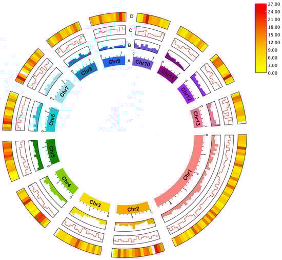 The sheep-biting louse B. ovis genome. The circus plot shows the genomic features for 13 pseudo-chromosomes: (A) Pseudo-chromosome, (B) GC content, (C) GC skew and (D) gene density. Gene density was represented by a colour gradient ranging from red to yellow, with higher density indicated by red, and lower density indicated by yellow. The pseudo-chromosome size scale is shown in Mb scale.