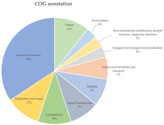 The COG functional annotation of the uniquely expressed genes in B. ovis. COG groups with less than 4% were grouped as “Others”, the details of these COG groups are listed in Supplementary File S1.