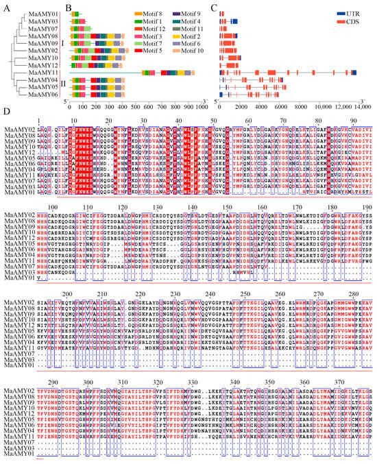 Bioinformatics analyses of the MaAMY gene family. (A) Phylogenetic evolution of the MaAMY protein family. UTR represents untranslated region. CDS represents coding sequence. (B) Motif analysis of the MaAMY gene family. (C) Gene structure analysis of the MaAMY gene family. (D) Multiple sequence alignment of MaAMY family amino acids, where red letters and blue boxes show the highly conservative positions and black letters indicate less conserved positions. Red line represents the α-amylase catalytic domain.