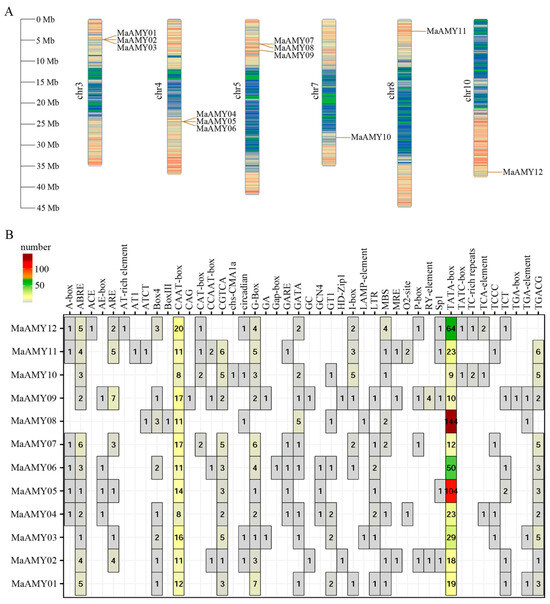 Chromosomal distribution and cis-acting element analysis of MaAMY family. (A) Chromosomal localization of 12 MaAMY gene family members. Green, blue, and orange colors represent low, medium, and high gene density in the region of the chromosome, respectively. (B) Promoter cis-acting elements of MaAMY genes; the number represents the number of cis-acting element in each MaAMY promoter.