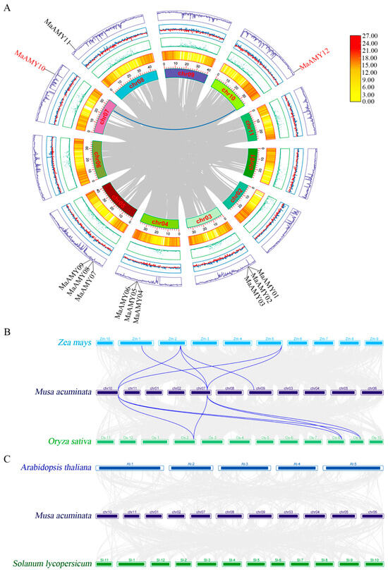Intergenomic and intragenomic synteny relationship of the AMY genes among banana (Musa acuminata), tomato (Solanum lycopersicum), maize (Zea mays), Arabidopsis (Arabidopsis thaliana), and rice (Oryza sativa). (A) Intergenomic synteny relationship between the MaAMY genes in the banana genome. Purple lines indicate the GC content. Red lines indicate the GC Skew. Green dots indicate the Nratio. Gray lines indicate the interchromosomal collinear relationship in the banana A genome. Blue lines indicate the intrachromosomal collinearity between MaAMY10 and MaAMY12. (B) Collinear AMY family gene pairs between tomato and banana and between banana and maize. (C) Collinear AMY family gene pairs between A. thaliana and banana and between banana and rice. Colored lines highlight the collinear gene pair.