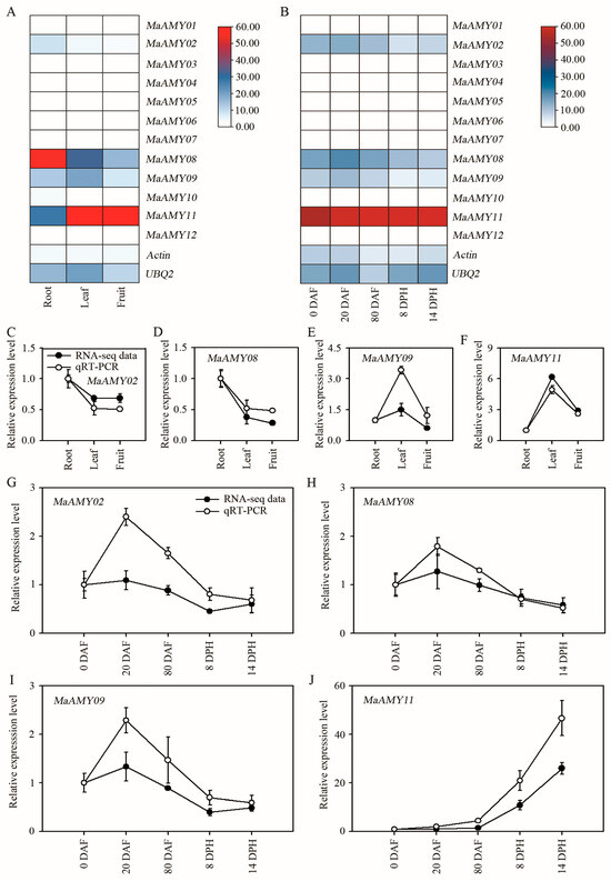 The spatio-temporal expression characteristics of the four expressed genes (MaMAY02, 08, 09, and 11) were further identified using quantitative real-time polymerase chain reaction (qRT-PCR). Following normalization, the relative expression of each gene in different organs or at different temporal stages was verified through comparison to the root and at 0 DAF, with the relative expression of each gene in the root or at 0 DAF considered “1”. The qRT-PCR results showed that all four MaAMYs exhibited better agreement with the RNA-seq data (Figure 5C–J). The correlation coefficients exceeded 0.9730 to 0.9998 for both the RNA-seq and qRT-PCR data in the different organs and at various temporal stages, respectively, implying that the RNA-seq data were reliable. Moreover, a higher abundance of MaAMY11 than other MaAMYs in the fruits or during banana fruit ripening was revealed by both the transcriptome data and qRT-PCR data, suggesting that MaAMY11 may play a crucial role in driving fruit ripening.