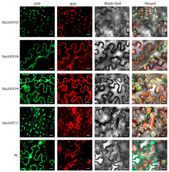 Co-localization of MaAMY02, 08, 09, and 11 proteins. The green fluorescent protein (GFP) fluorescence is represented by green, whereas red fluorescent indicates red fluorescent proteins (RFPs). A composite image was created by merging the GFP and RFP fluorescence images, represented under “merge”. PC represented the positive control (pCAMBIA1302-GFP plasmid). Scale bars = 10 μm.