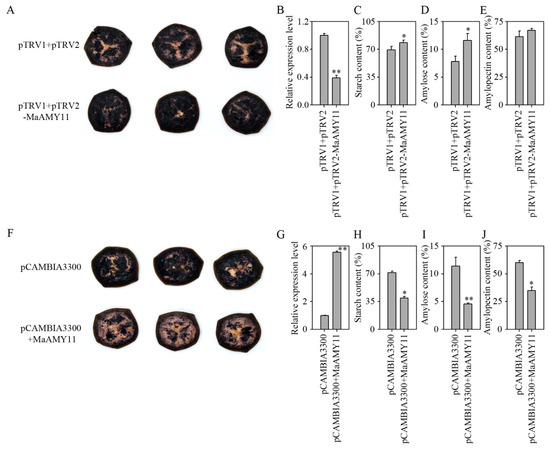 The function of MaAMY11, which had the highest expression level during banana ripening, was evaluated. As shown in Figure 7A, transient silencing of MaAMY11 expression led to darker staining by iodine–potassium–iodide (I2-KI) in banana fruit discs compared to the controls. In the transiently silenced fruit discs, the expression level of MaAMY11 was obviously decreased (Figure 7B), but the contents of total starch, amylose, and amylopectin were obviously increased by 9.49%, 3.76%, and 5.73%, respectively, compared with the empty vector (Figure 7C–E). By contrast, lighter staining by I2-KI was exhibited in the banana fruit discs by transiently overexpressing MaAMY11 (Figure 7F). The expression level of MaAMY11 was obviously increased in overexpressing fruit discs (Figure 7G), whereas the total starch, amylose, and amylopectin contents were significantly decreased by approximately 31.77%, 6.81%, and 24.97%, respectively (Figure 7H–J).