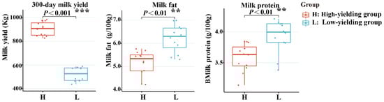 | Milk Traits | High-Yielding Camels | Low-Yielding Camels | p-Value | Sign. | ||||
