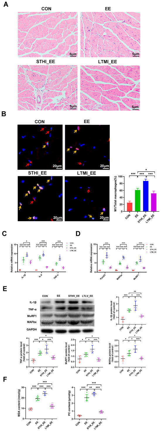 Effects of two different training modalities on muscle damage in mice submitted to exhaustive swimming. (A) representative images of H&E staining of gastrocnemius sections (n = 6 per group). (B) representative merged images of double immunofluorescence staining for F4/80 (red) and iNOS (green) to respectively identify total macrophages and M1 macrophages in gastrocnemius sections. Red arrows indicate macrophages, yellow arrows indicate M1 macrophages. Bar graphs show quantification of M1-type macrophages (% of total macrophages in each field) in different groups. (C) mRNA levels of inflammatory cytokines IL-1β, IL-6, and TNF-α in gastrocnemius. (D) mRNA levels of muscle atrophy-related genes FoxO3, MAFbx, and MuRF1 in gastrocnemius (n = 6 per group). (E) representative Western blots and quantified protein levels of IL-1β, TNF-α, MAFbx, and MuRF1 in gastrocnemius (n = 6 per group). (F) contents of oxidative stress biomarkers MDA and PC in gastrocnemius. Data are presented as means ± SD. Two-way ANOVA multiple comparison test was used (n = 6 per group). * p < 0.05, ** p < 0.01, *** p < 0.001. CON, sedentary group; EE, exhaustive exercise group; STHI_EE, exhaustive exercise after short-term, high-intensity training group; LTMI_EE, exhaustive exercise after long-term, moderate-intensity training group; H&E, Hematoxylin and Eosin; iNOS, inducible Nitric Oxide Synthase; IL-1β, Interleukin-1 beta; IL-6, Interleukin-6; TNF-α, Tumor Necrosis Factor alpha; FoxO3, Forkhead box O3; MAFbx, Muscle Atrophy F-box; MuRF1, muscle-specific RING Finger Protein 1; MDA, malondialdehyde; PC, protein carbonyl.