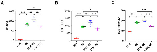 Serum levels of CK, LDH, and BUN in mice following exhaustive swimming. (A) Serum levels of CK; (B) serum levels of LDH; (C) serum levels of BUN. Each data point represents the mean ± standard deviation (SD) of the measured values. Inter-group comparisons were conducted using Student’s t-test, with statistical significance denoted by asterisks: * p < 0.05, ** p < 0.01, *** p < 0.001 (n = 6 per group). CON, sedentary group; EE, exhaustive exercise group; STHI_EE, exhaustive exercise after short-term, high-intensity training group; LTMI_EE, exhaustive exercise after long-term, moderate-intensity training group; CK, creatinine kinase; LDH, lactate dehydrogenase; BUN, blood urine nitrogen.