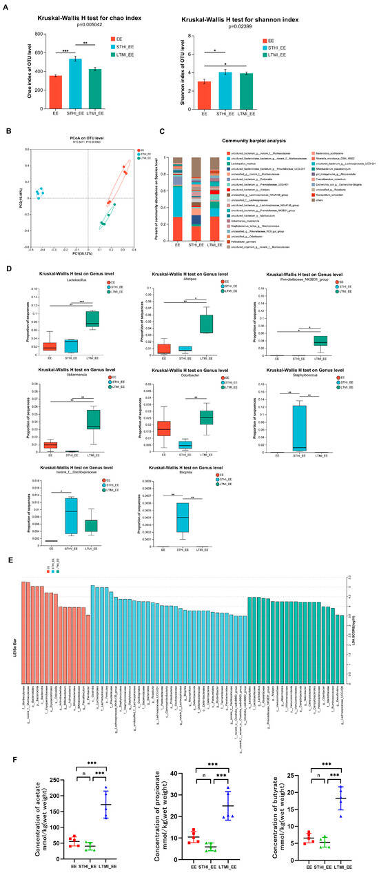 Effects of two different training modalities on gut microbiota composition and fecal SCFAs in mice before engaging in exhaustive exercise. (A) gut microbiota diversity using the Chao and Shannon indices (n = 5 per group). (B) a clear separation was observed by principal coordinate analysis (PCoA) based on Hellinger (n = 5 per group). (C) species–level bacterial community structure across different groups (n = 5 per group). (D) Kruskal–Wallis H test bar plot at the genus level (n = 5 per group). (E) bar graph of linear discriminant analysis (LDA) scores, showing a biomarker taxa (LDA score of >3.5 and a significance of p < 0.05 determined by the Wilcoxon signed–rank test) (n = 5 per group). (F) variations in the abundance of short–chain fatty acids. * p < 0.05, ** p < 0.01, *** p < 0.001. (Student’s t-test; n, no significance). EE, exhaustive exercise group; STHI_EE, exhaustive exercise after short–term, high–intensity training group; LTMI_EE, exhaustive exercise after long–term, moderate–intensity training group.