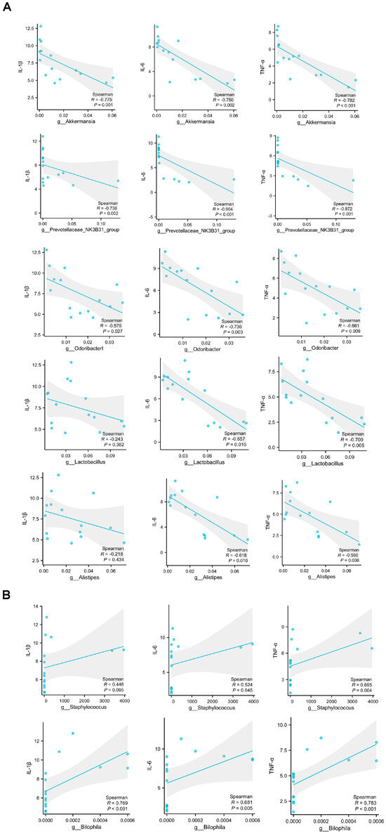 Correlation analysis of muscle damage indicated by the levels of pro–inflammatory cytokines expression and the gut microbial community at the genus level. (A) plots show the relationship between the level of IL-1β, IL-6, and TNFα mRNA and the abundance of Akkermansia, Prevotellaceae_NK3B31_group, Odoribacter, Alistipes, and Lactobacillus, represented as a smoothing spline with a 95% confidence interval (shaded region). (B) plots show the relationship between the level of IL-1β, IL-6, and TNFα mRNA and the abundance of Staphylococcus and Bilophila, represented as a smoothing spline with a 95% confidence interval (shaded region). ((A,B), Pearson’s correlation). IL-1β, Interleukin-1 beta; IL-6, Interleukin-6; TNF-α, Tumor Necrosis Factor alpha.
