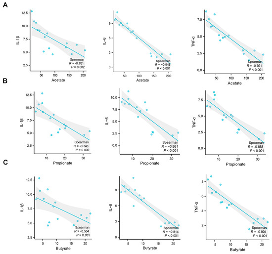 Correlation analysis of muscle damage indicated by the levels of pro-inflammatory cytokines expression and fecal SCFAs levels. (A–C) plots show the relationship between the level of IL-1β, IL-6, and TNFα mRNA and the content of acetate, propionate, and butyrate in feces, represented as a smoothing spline with a 95% confidence interval (shaded region). ((A–C), Pearson’s correlation). IL-1β, Interleukin-1 beta; IL-6, Interleukin-6; TNF-α, Tumor Necrosis Factor alpha.