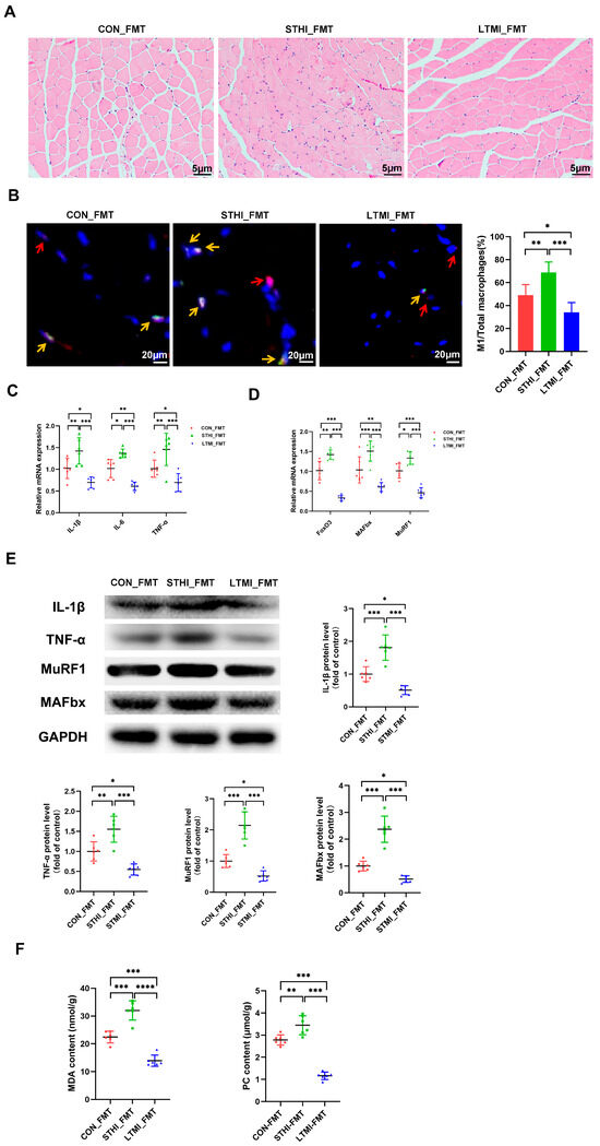 Effects of fecal microbiota transplantation from mice subjected to different exercise training modalities on muscle damage induced by exhaustive exercise. (A) representative images of H&E staining of gastrocnemius sections (n = 6 per group). (B) representative merged images of double immunofluorescence staining for F4/80 (red) and iNOS (green) to respectively identify total macrophages and M1 macrophages in gastrocnemius sections. Red arrows indicate macrophages, yellow arrows indicate M1 macrophages. Bar graphs show quantification of M1-type macrophages (% of total macrophages in each field) in different groups. (C) mRNA levels of inflammatory cytokines TNF-α, IL-1β, and IL-6 in gastrocnemius. (D) mRNA levels of muscle atrophy-related genes FoxO3, MAFbx, and MuRF1 in gastrocnemius (n = 6 per group). (E) representative Western blots and quantified protein levels of IL-1β, TNF-α, MuRF1, and MAFbx in gastrocnemius (n = 6 per group). (F) the contents of oxidative stress biomarkers MDA and PC in gastrocnemius. Data are presented as means ± SD. Two-way ANOVA multiple comparison test was used (n = 6 per group). * p < 0.05, ** p < 0.01, *** p < 0.001, **** p < 0.0001. CON_FMT, transplantation of fecal microbiota of sedentary mice in study 1; STHI_FMT, transplantation of fecal microbiota of STHI training mice in study 1; LTMI_FMT, transplantation of fecal microbiota of LTMI training mice in study 1; H&E, Hematoxylin and Eosin; iNOS, inducible Nitric Oxide Synthase; IL-1β, Interleukin-1 beta; IL-6, Interleukin-6; TNF-α, Tumor Necrosis Factor alpha; FoxO3, Forkhead box O3; MAFbx, Muscle Atrophy F-box; MuRF1, muscle-specific RING Finger Protein 1; MDA, malondialdehyde; PC, protein carbonyl.