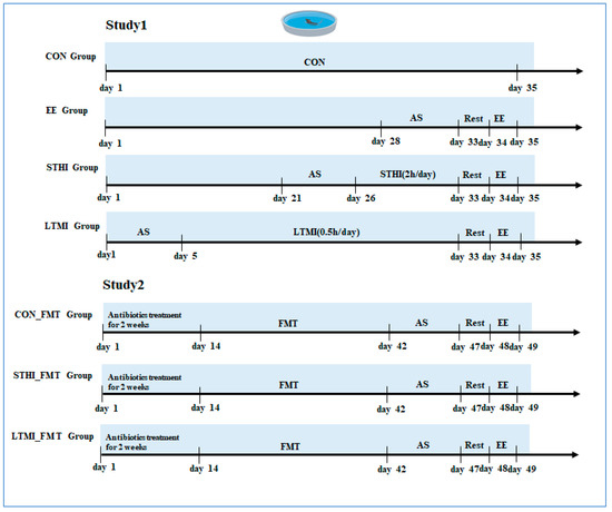 A schematic of the experimental schedule. AS, adaptive swimming; CON, control; EE, exhaustive exercise; STHI, short-term, high-intensity training; LTMI, long-term, moderate-intensity training; CON_FMT, transplantation of fecal microbiota of sedentary mice in study 1; STHI_FMT, transplantation of fecal microbiota of short-term, high-intensity training mice in study 1; LTMI_FMT, transplantation of fecal microbiota of long-term, moderate-intensity training mice in study 1.