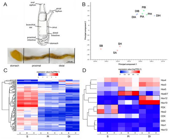 RNA-seq approach and preliminary results. (A) The anatomical parts of the Ciona gastrointestinal tract analyzed separately. S = stomach, PI = proximal intestine, DI = distal intestine, blue. (B) Principal component analysis, constructed based on log-transformed Transcript Per Million (TPM) expression values of all genes, summarizing the relatedness of the transcriptional profiles of the three biological samples of S (SA, SB, and SH), PI (PIA, PIB, and PIH), and DI (DIA, DIB, and DIH). (C) Heat map representing the log-transformed TPM expression levels of all DEGs characterized by fold change (FC) > 10 in at least one pairwise comparison among S, PI, and ID. DEGs were hierarchically clustered based on Euclidean distance, using an average linkage method. (D) Heat map representing the log-transformed TPM expression levels of the Hox and paraHox genes, hierarchically clustered based on Euclidean distance, using an average linkage method. Genes displaying statistically significant over-expression in one of the three GI tracts are boxed. The terms A, B, and H refer to different individual animals; for details, see the Material and Methods (Section 4).