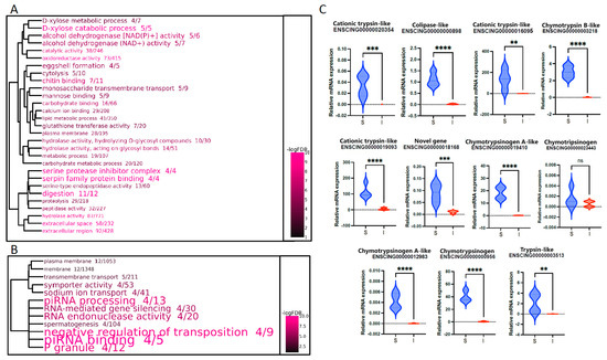 The dendrograms reported in Figure 2A,B provide an overview of the statistical significance of the over-representation of the Gene Ontology (GO) terms associated with the 915 DEGs upregulated in S (panel A) and the 56 DEGs upregulated in I (panel B), as well as of the relationships among such annotations. Consistent with the elevated number of DEGs associated with S, this region of the digestive tract exhibited a diverse array of over-represented GO terms. The annotations specifically enriched in S were linked with digestive processes (mostly because of the strong over-expression of serine proteases and their inhibitors) and secretory hydrolases. On the other hand, the few enriched GO terms identified in I were linked with a small number of DEGs belonging to the Piwil family, which encode P-element-induced wimpy testis-like proteins and are involved in the biogenesis of piRNAs and the silencing of transposable elements.