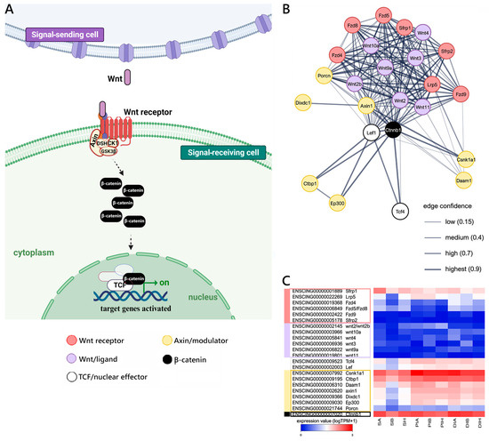Canonical WNT signaling reconstruction. (A) Schematic view of the WNT/βcatenin pathway realized using BioRender.com (accessed on 13 September 2023). (B) STRING networks represent the interactions among selected genes linked with the Wnt pathway, arbitrarily classified as ligands, receptors, nuclear effectors, modulators, targets, and related genes. Only mouse genes sharing at least one orthologous gene with C. robusta are shown. Gene interaction networks were constructed based on known or inferred relationships among mouse orthologs. (C) Heat map representing the log-transformed TPM expression levels of the main genes (excluding target and related genes) included in the STRING network, observed in C. robusta S, PI, and DI samples.