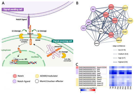 Canonical Notch signaling reconstruction. (A) Schematic view of the Notch pathway realized using BioRender.com (accessed on 13 September 2023). (B) STRING networks representing the interactions among selected genes linked with the Notch pathway, arbitrarily classified as ligands, receptors, nuclear effectors, modulators, targets, and related genes. Only mouse genes sharing at least one orthologous gene with C. robusta are shown. Gene interaction networks were constructed based on known or inferred relationships among mouse orthologs. (C) Heat map representing the log-transformed TPM expression levels of the main genes (excluding target and related genes) included in the STRING network observed in C. robusta S, PI, and DI samples.