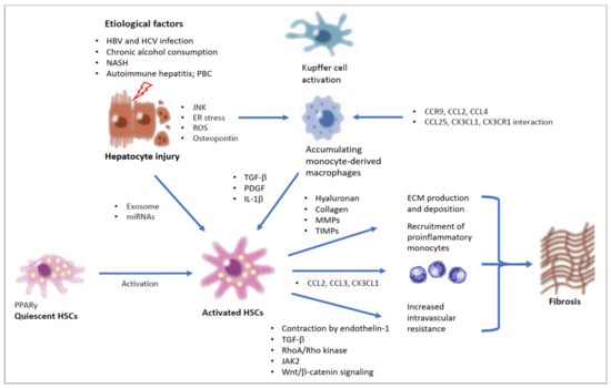 In chronic liver disease, a close and potent relationship between inflammation and fibrosis has been proven [2,5]. Inflammation, the hallmark of chronic liver disease, drives progressive ECM deposition over time, which, in the long term, can progress to liver cirrhosis, end-stage liver failure, and liver cancer [4,5]. In contrast, successful antiviral treatment in patients with chronic viral hepatitis or with considerable lifestyle changes in NASH patients modulate the resolution of fibrosis [6,7,8,9]. These clinical observations suggest that hepatic fibrosis is a dynamic process in which inflammatory mechanisms play a dual role; on the one hand, they initiate and maintain fibrogenesis, while, on the other hand, they promote fibrolysis and fibrosis resolution [5]. Activated HSCs, as well as resident immune cells, promote the recruitment of ECM proteins within the sinusoids, leading to circulatory disorders [4]. In fact, HSCs are the main effector cells during hepatic fibrogenesis [2,5].